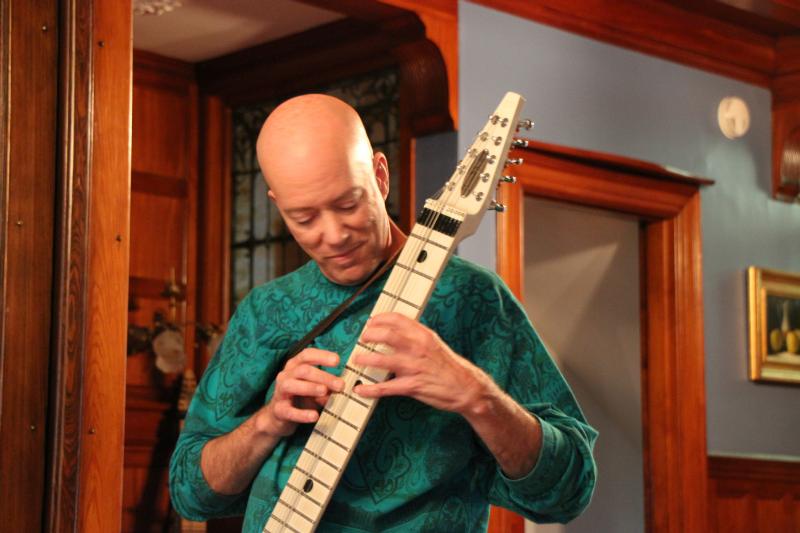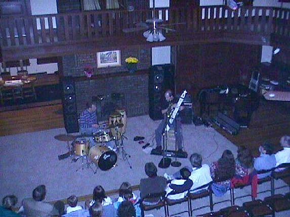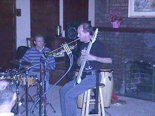 Steve and Matt Houston performing at the 1998 CD release of Native American Music Meets The Chapman Stick, featuring music of five Native American tribes, transcribed for Chapman Stick and Percussion, and sh, featuring primarily original music for Chapman Stick, Trumpet, and Percussion